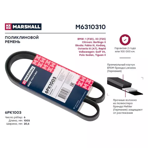 Ремень поликлиновой 6PK1003 BMW: 1 (F20), X3 (F25) Citroen: Berlingo II Skoda: Fabia III, Kodiaq, Octavia III (A7), Rapid Volkswagen: Golf VII, Polo Sedan, Tiguan II; кросс-номер GATES 6PK1003; OEM 11287618848; 51761849; 55193366; 04E145933R